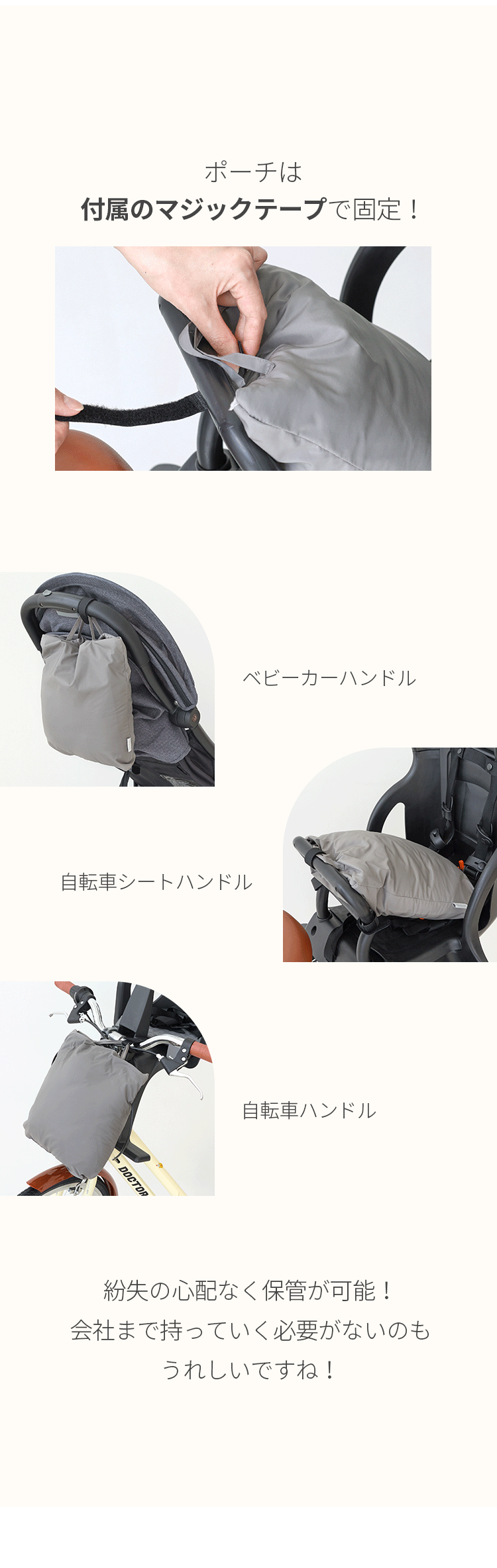 さらに本体をパッとポーチに変身させ、自転車やベビーカーにかけておくことも可能です。