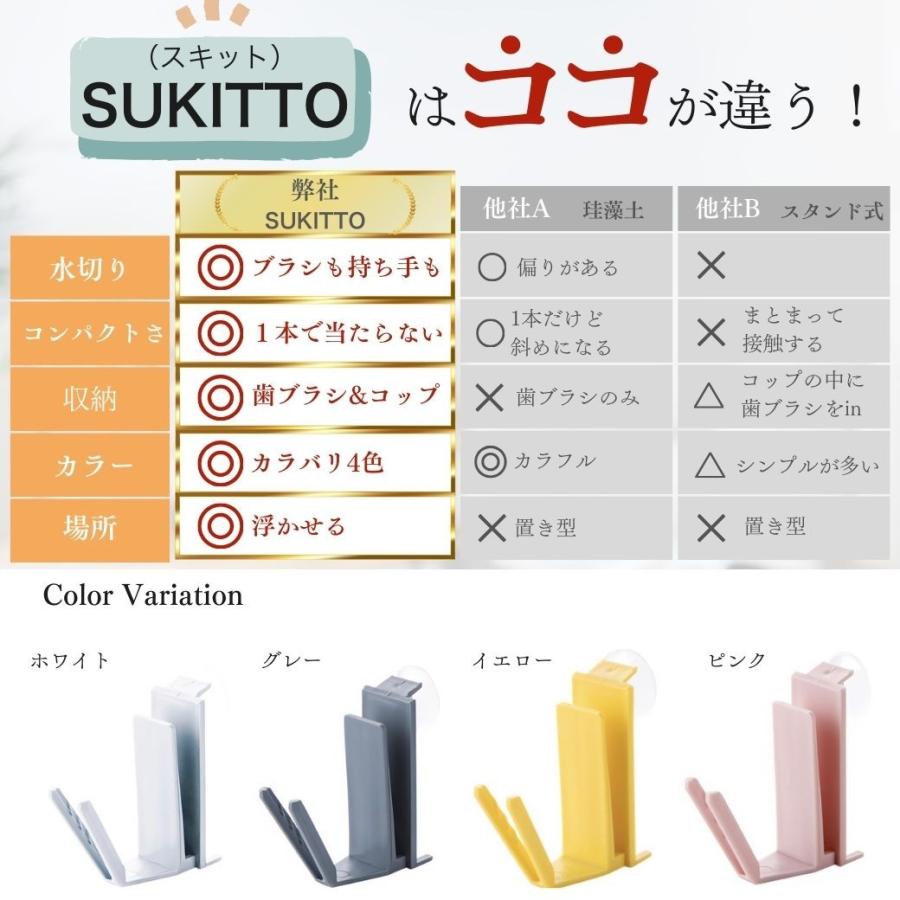 ・特徴:吸盤タイプの浮かせる歯ブラシスタンド。歯ブラシとコップを吊り下げて水切りが可能です。吊り下げて1本ずつ独立して浮かせることができる歯ブラシスタンドで接触もなく衛生的です。歯ブラシホルダーだけでなく、コップを蓋の代わりに被せることができるので、水回りで気になる埃や落ちた髪の毛から歯ブラシを守ることができます。吸盤で浮かせて吊り下げるので洗面台に接触することなく、歯ブラシを立てることができるので衛生的に保つことができます。