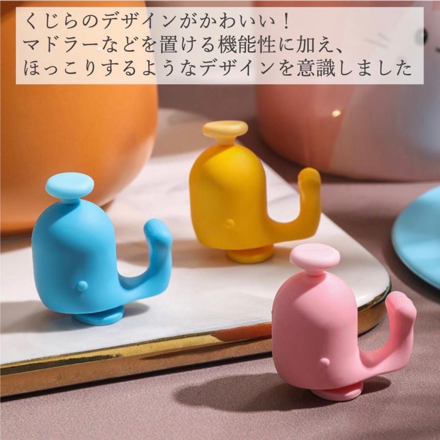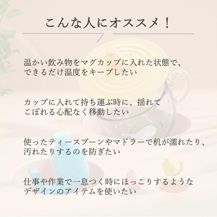・特徴:マグカップの蓋として使えるシリコン製のカップカバー。持ち運ぶ時の吹きこぼれを防いだり、飲み口から逃げる熱をブロックして飲み物の暖かさをキープしてくれます。くじらの持ち手はティースプーン置きにもなり、マドラーとして利用した後もテーブルを汚さずに置くことができます。
