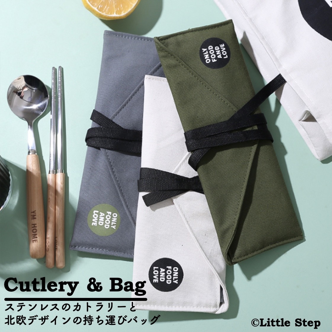 ・特徴:布のおしゃれなケース付きのカトラリーセット。ランチのお弁当用やキャンプなどのアウトドアに持ち運べる便利なカトラリーです。布でできたおしゃれなカバーを使って自由に持ち運ぶことができます。