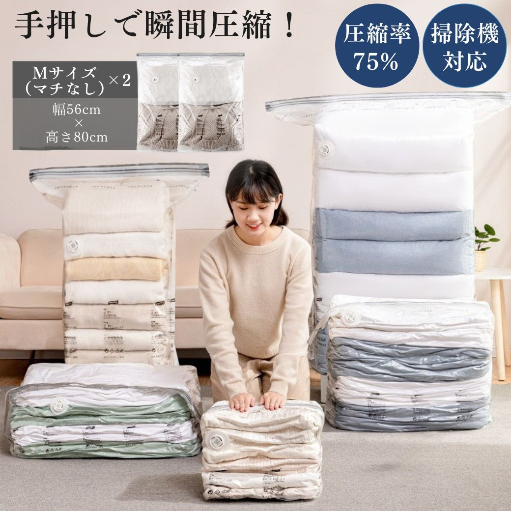圧縮袋 2枚セット 衣類 旅行用 衣替え 手押し 掃除機不要 使用可 繰り返し使える M(マチなし) 爆買