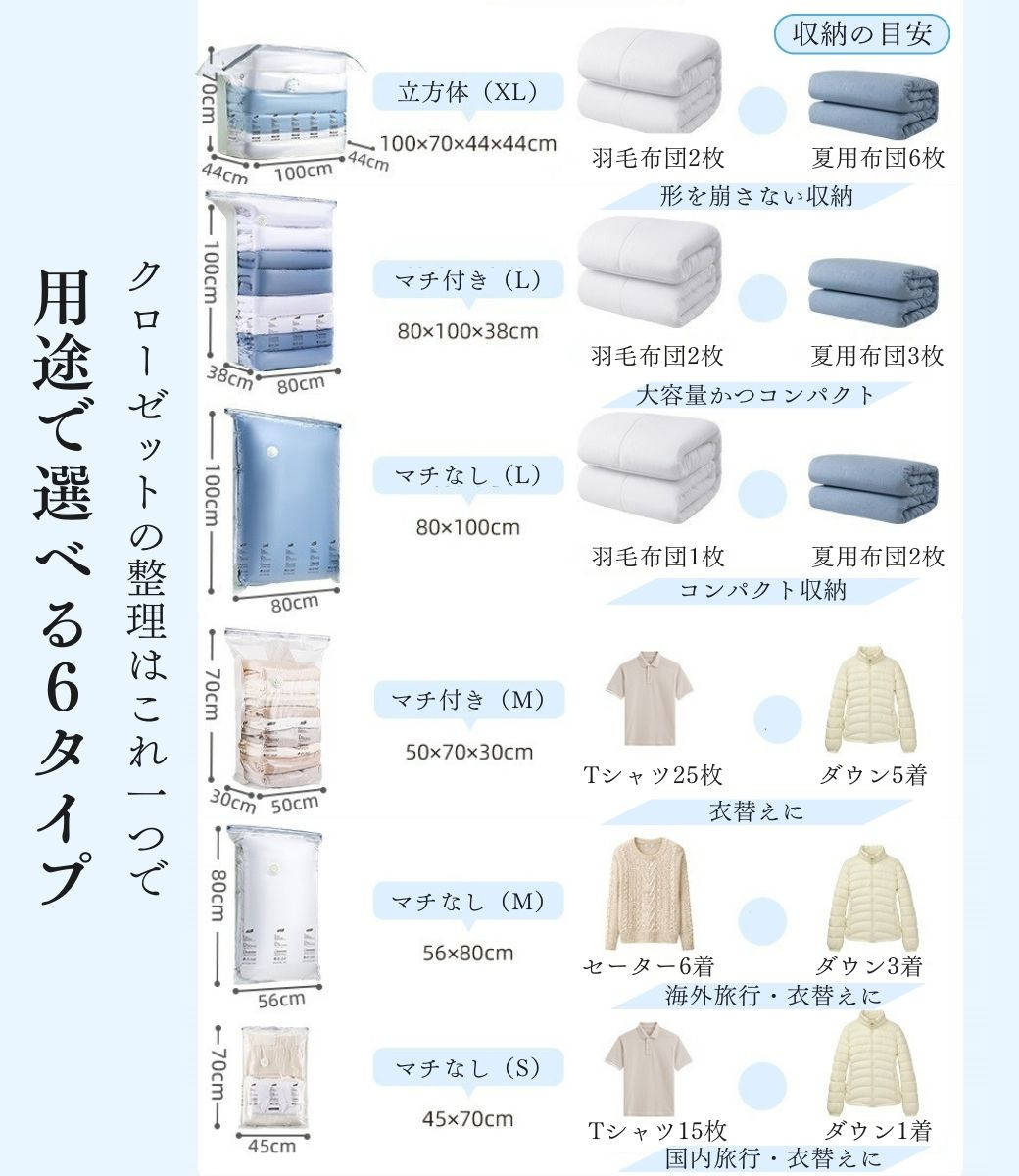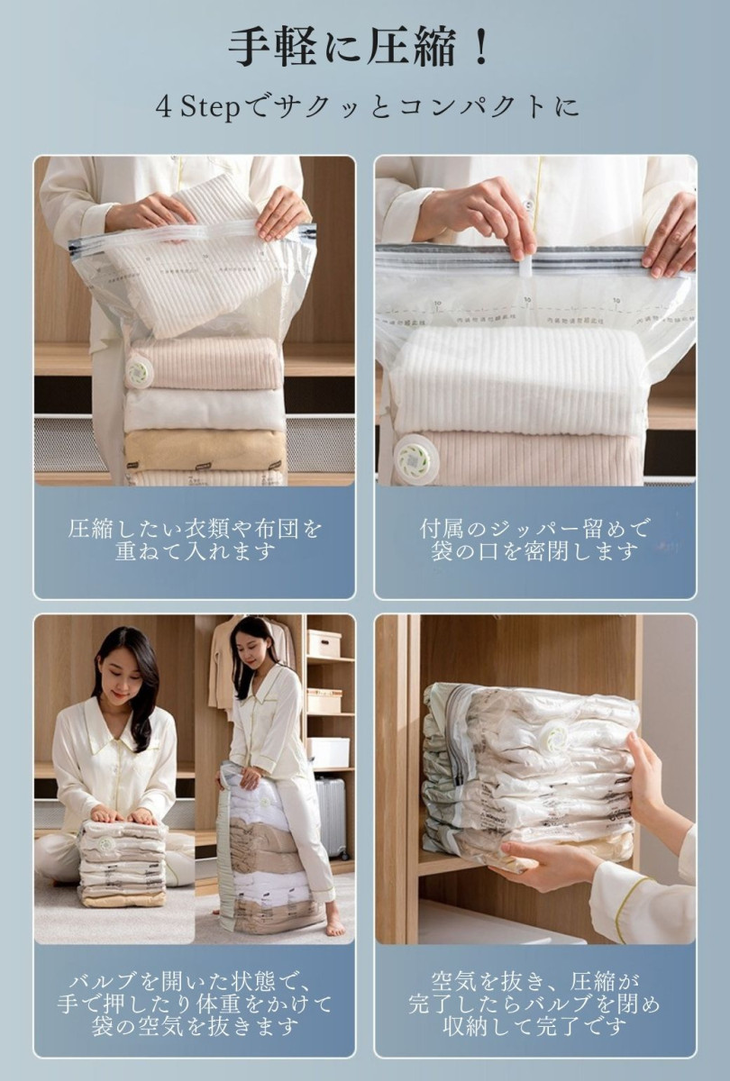 ・特徴:衣類や布団を収納できる圧縮袋。旅行や衣替えでコンパクトに収納できる便利グッズです。手押しも掃除機も使える手軽さも人気です。また、真空密封で湿気、害虫などから大切な衣類を保護します。袋の半分が透明で中が見やすく、収納したものをすぐ探せるのも魅力的です。