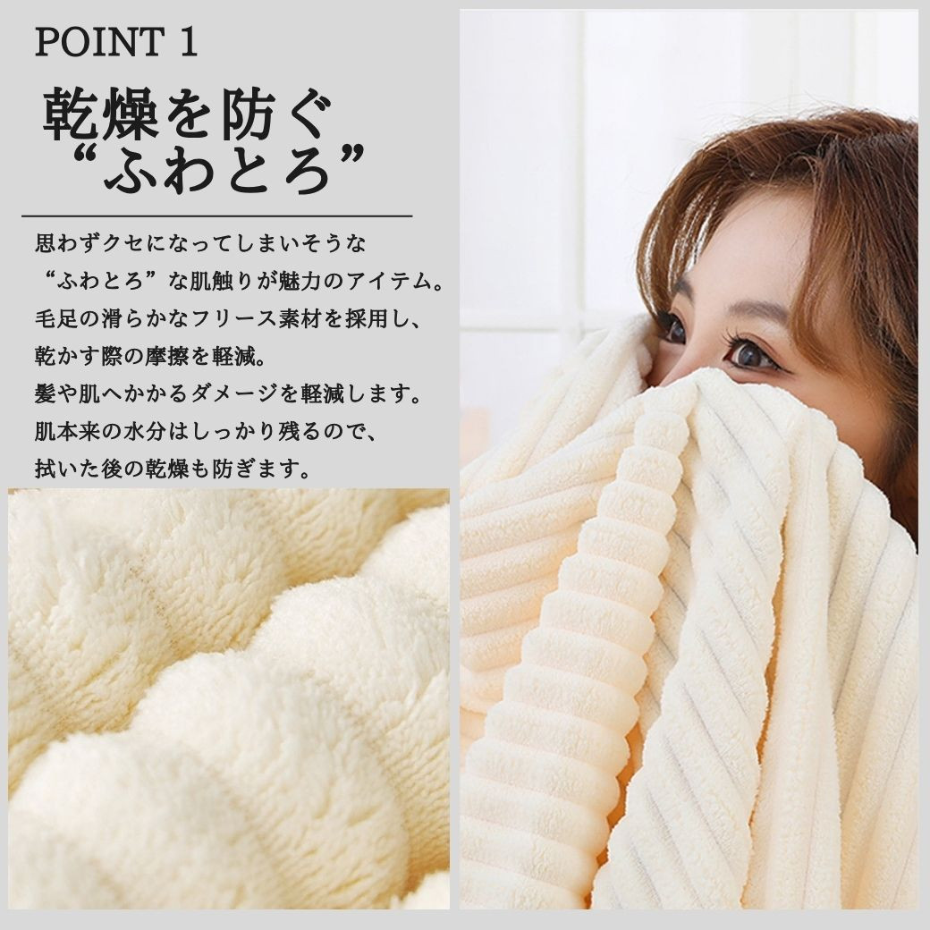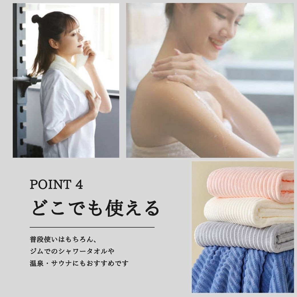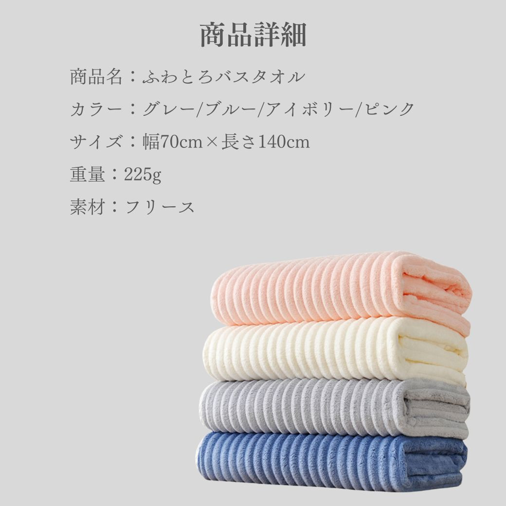 ・特徴:ふわとろ大判サイズのバスタオル。厚手の柔らかい肌触りが気持ち良いバスタオルです。ジムなどでのシャワータオルや温泉・サウナでの利用、出産祝いや内祝いのギフトなどにも人気の商品です。