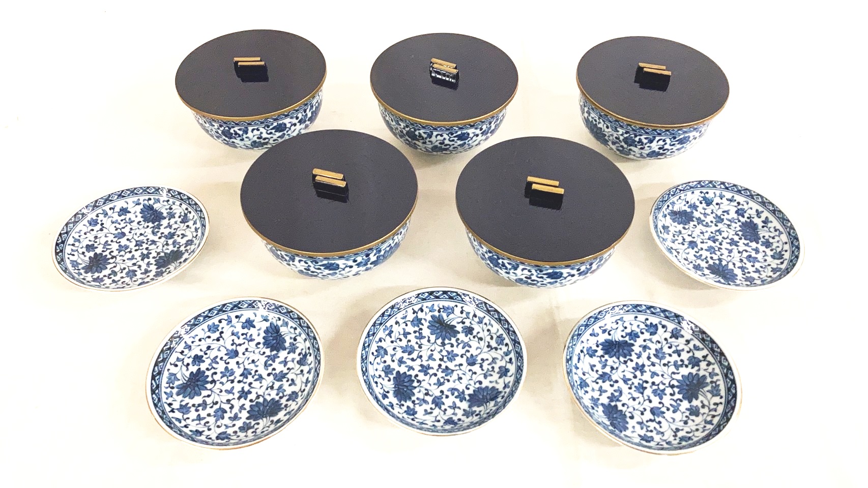 高峰の蓋付深皿5点と小皿5点のセットになります。商品は本体のみで共箱等はございません。