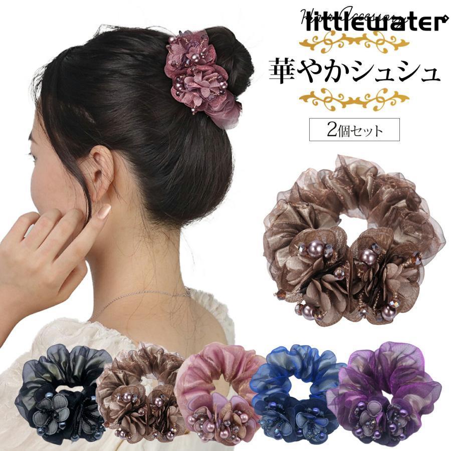 シュシュ 小さめ セット 黒 2個セット ヘアアクセサリー 花 ヘアゴム おしゃれ アクセサリー 髪ゴム ヘアアクセ 上品 かわいい 髪飾り 髪留め