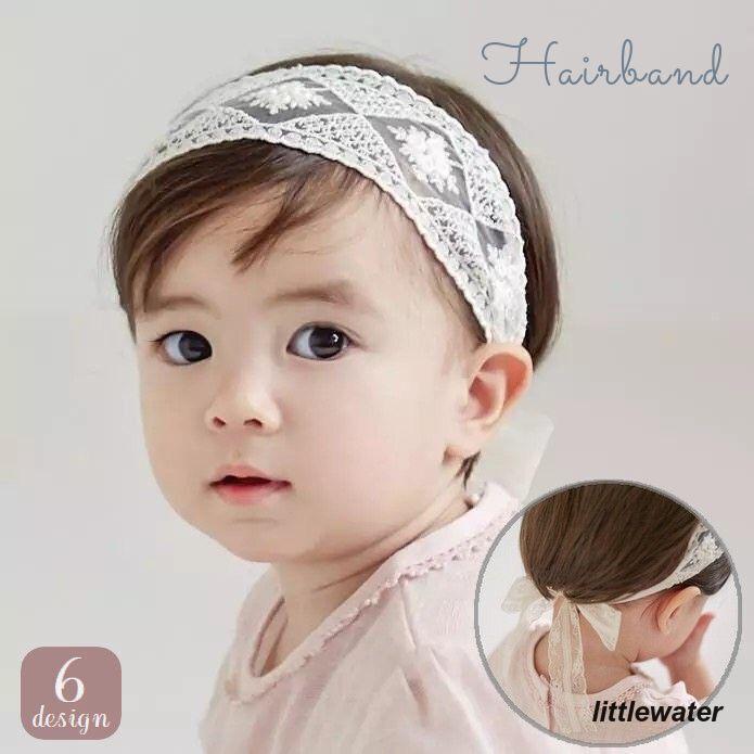 レース素材にリボンやお花の飾りを合わせたキュートなベビー用ヘアバンド。