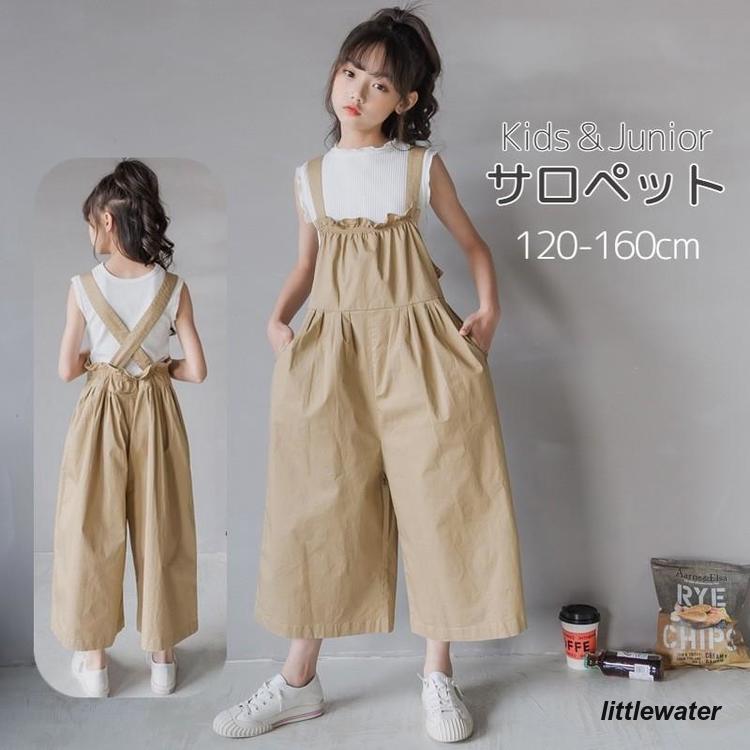 オーバーオール サロペット キッズ ジュニア 子供 女の子 9分丈 オールインワン つなぎ カジュル ワイドパンツ ロングパンツ ギャザーフリル ゆっ