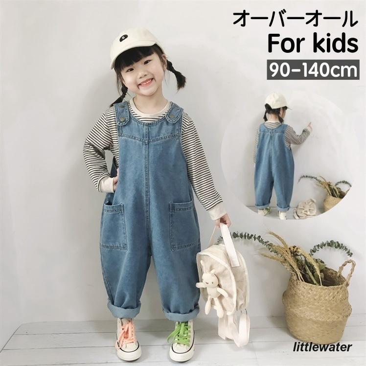 オーバーオール デニム キッズ ベビー 子供 女の子 男の子 ボトムス サロペット ロング丈 ロングパンツ ポケット 無地 シンプル カジュアル お洒