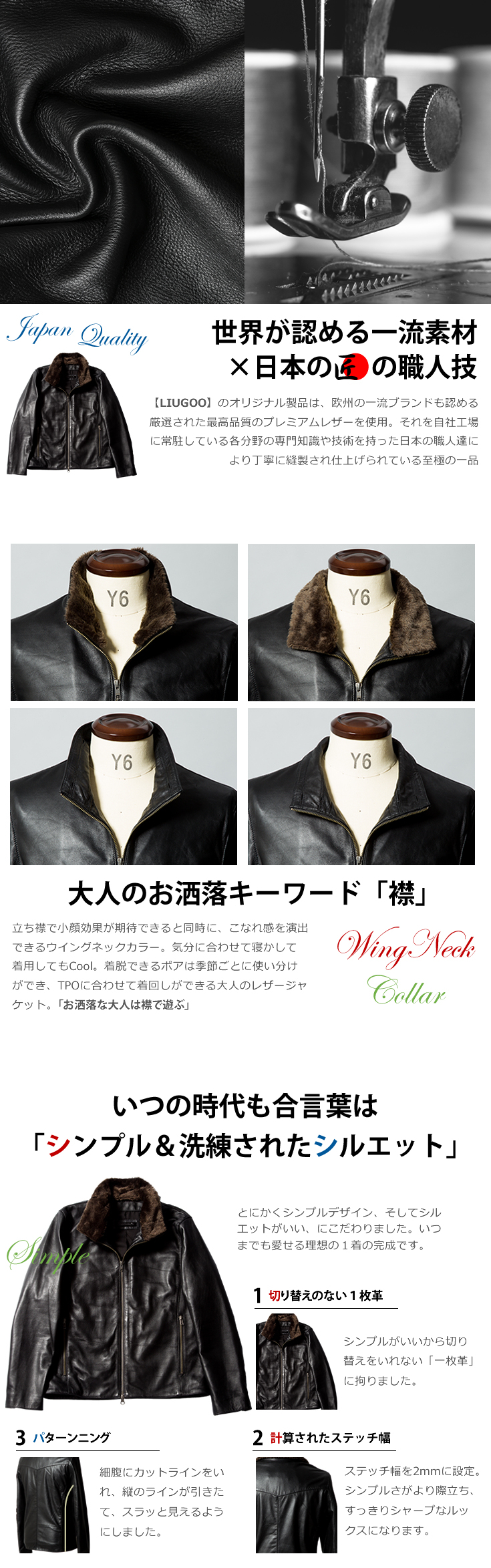 | ●デザイン 「Simple is best」を体現した、徹底的に無駄を省いたレザージャケット。立ち襟のウイングネックは、立てても寝かせても洒落感を楽しめます。 |