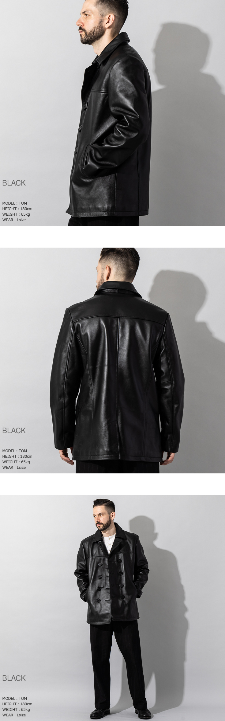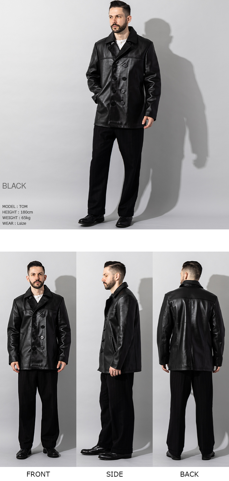 ●スタイルアメカジやワークスタイル、 そして大人のキレイめカジュアルにもフィットするレザーのピーコートです。 着丈を長すぎず、短すぎずと、 いった絶妙の丈感で仕上げているので、着回しも抜群に効くコートと言えます。 |
