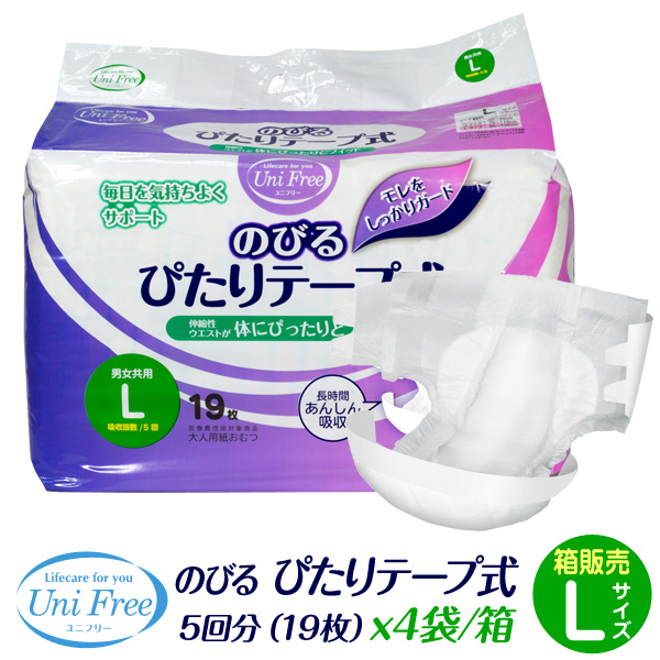 テープ式紙おむつ L 5回吸収(19枚)x4袋 箱販売 76枚/箱 unifree オムツ1300CC吸収