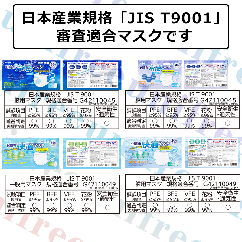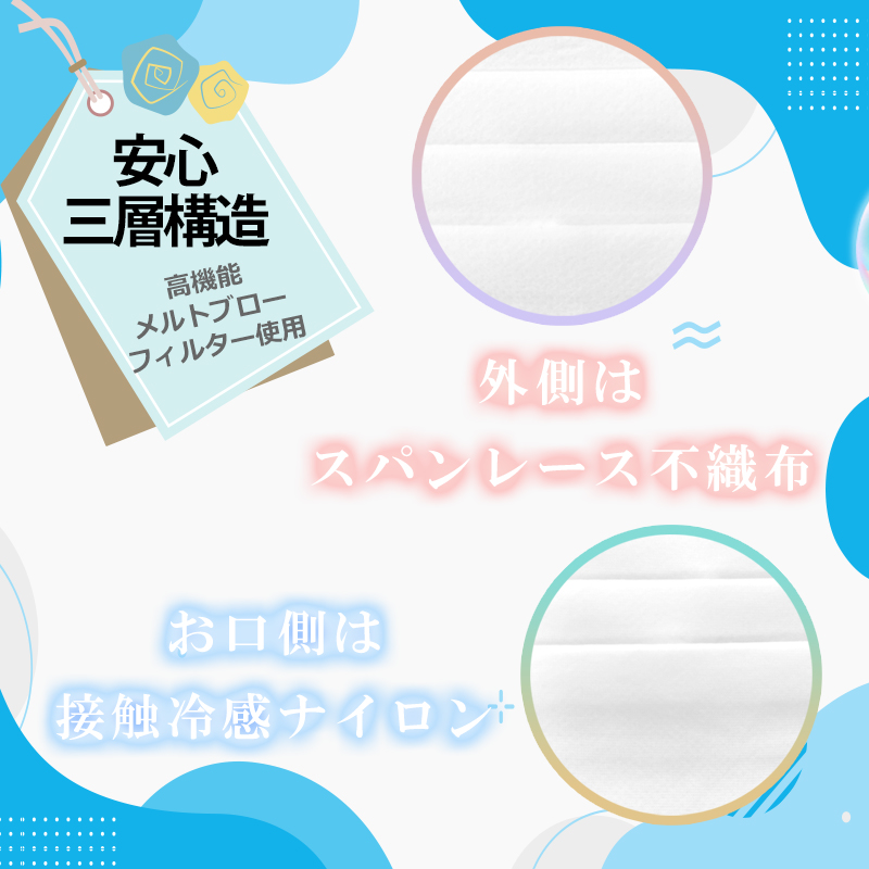 | 素材 | (三層構造) ■本体及びフィルター部:ポリプロピレン不織布 ■本体布部:ナイロン ■耳ひも部:ポリエチレン、ポリウレタン ■ノーズフィッター:ポリエチレン |