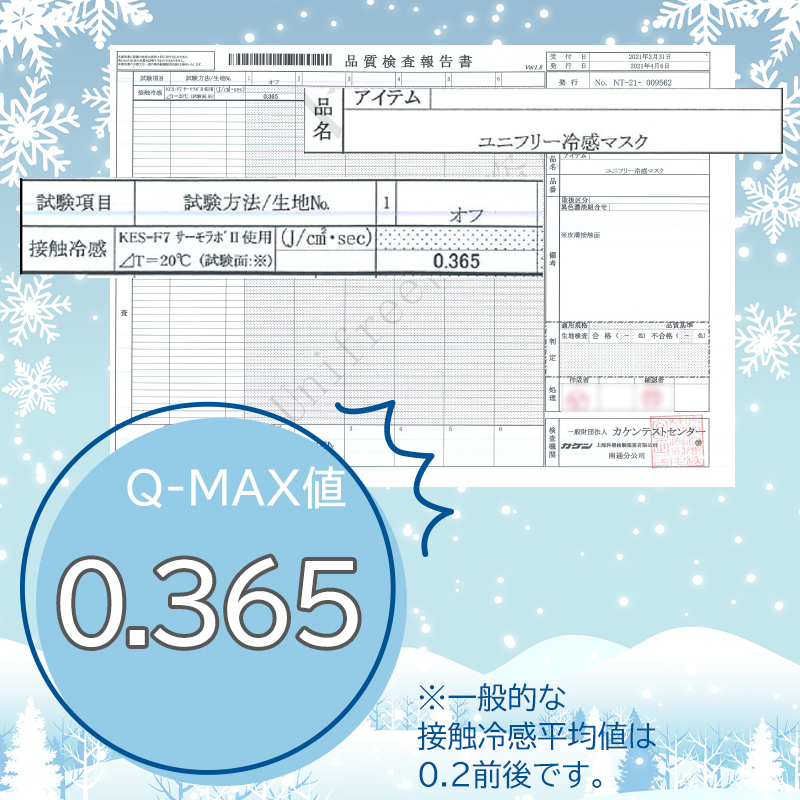■顔側は接触冷感素材(ナイロン)でつけた瞬間に冷たさを感じる。Q-max値(最大熱吸収速度)0.365を実現