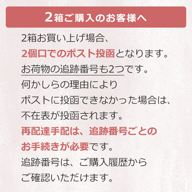 ※1〜2箱ご購入の場合、ゆうパケットで2個口でのお届けとなります。店頭パッケージは付属しません。
