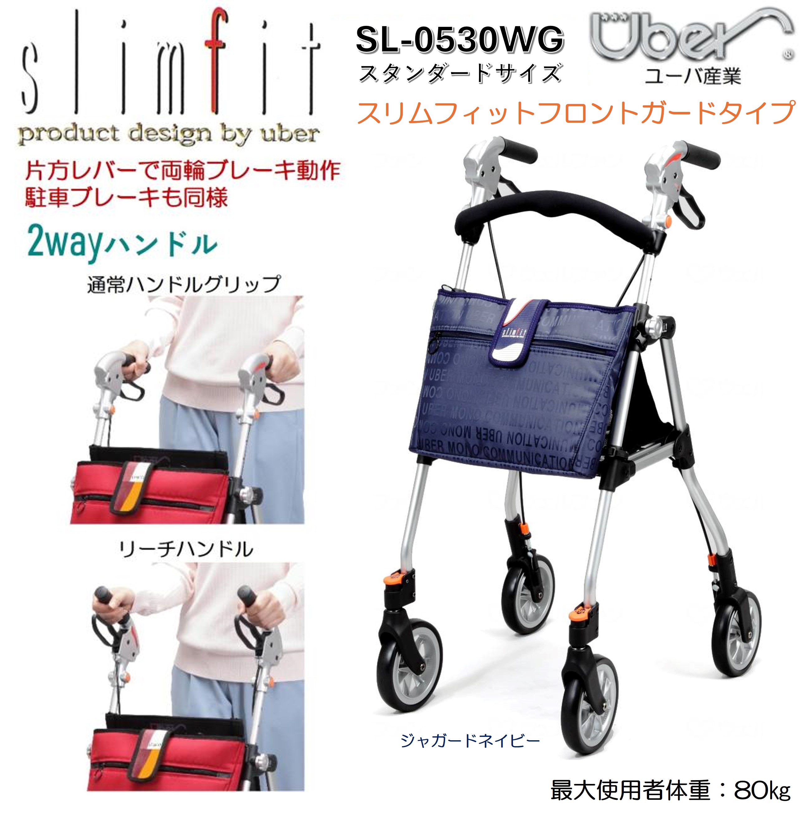 歩行車 歩行器 屋外 屋内 スリムフィット ガード付 スタンダードサイズ ジャガードネイビー SL-0530WG 軽量 コンパクト 2WAYハンドル 送料無料 ユーバ産業