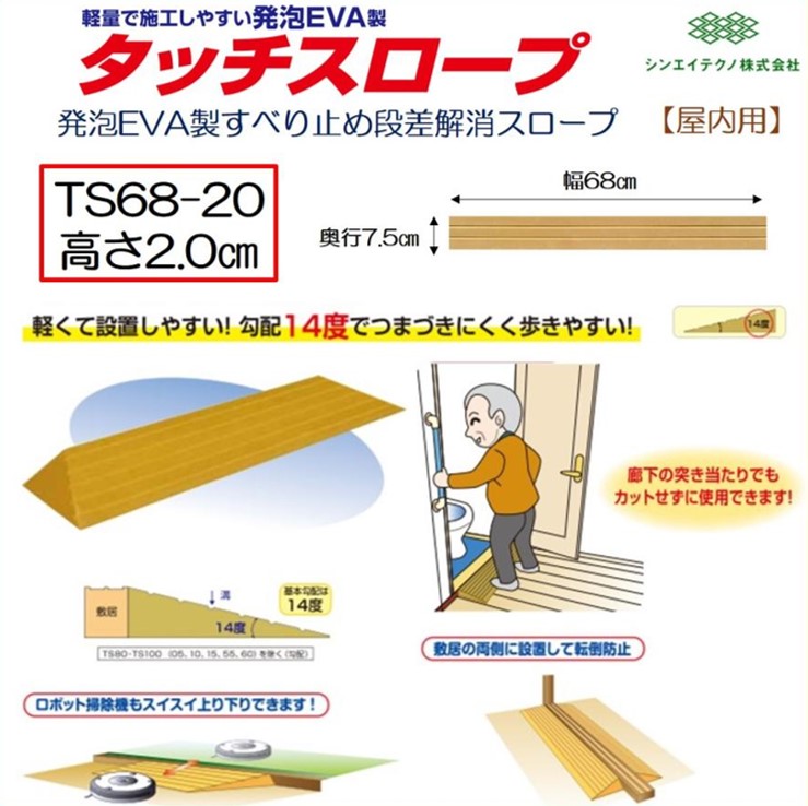段差解消 屋内用 スロープ 段差 タッチスロープ 幅68cm TS68-20 高さ2.0cm シンエイテクノ