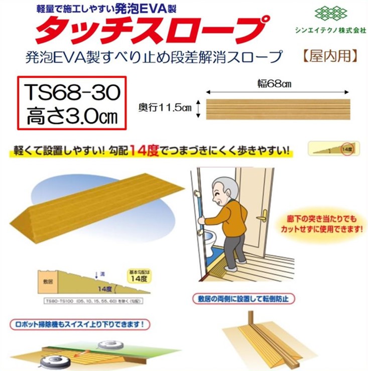段差解消 屋内用 スロープ 段差 タッチスロープ 幅68cm TS68-30 高さ3.0cm シンエイテクノ