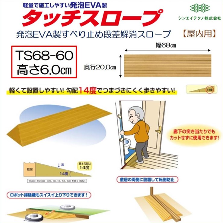 段差解消 屋内用 スロープ 段差 タッチスロープ 幅68cm TS68-60 高さ6.0cm シンエイテクノ