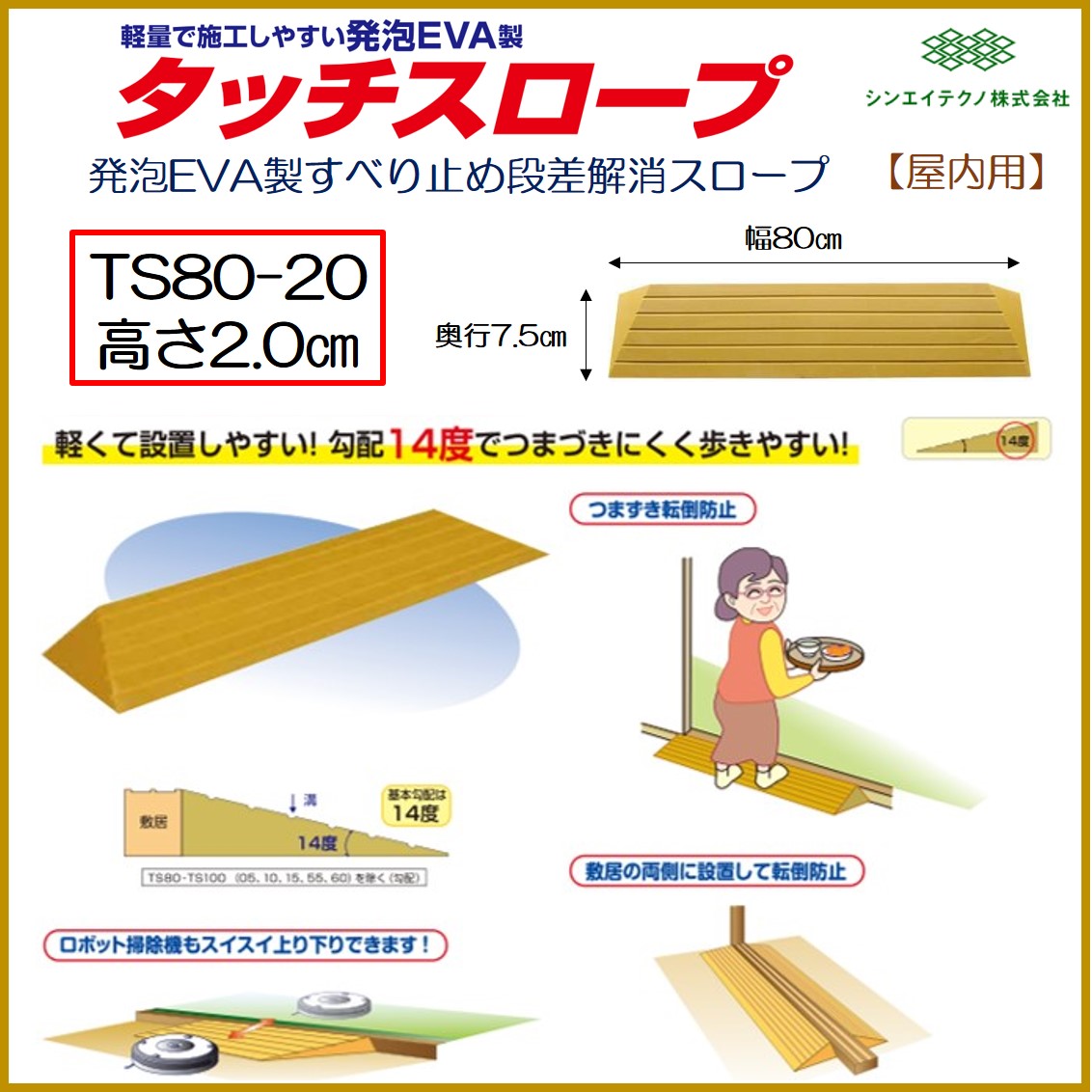 段差解消 屋内用 スロープ 段差 タッチスロープ 幅80cm TS80-20 高さ2.0cm シンエイテクノ