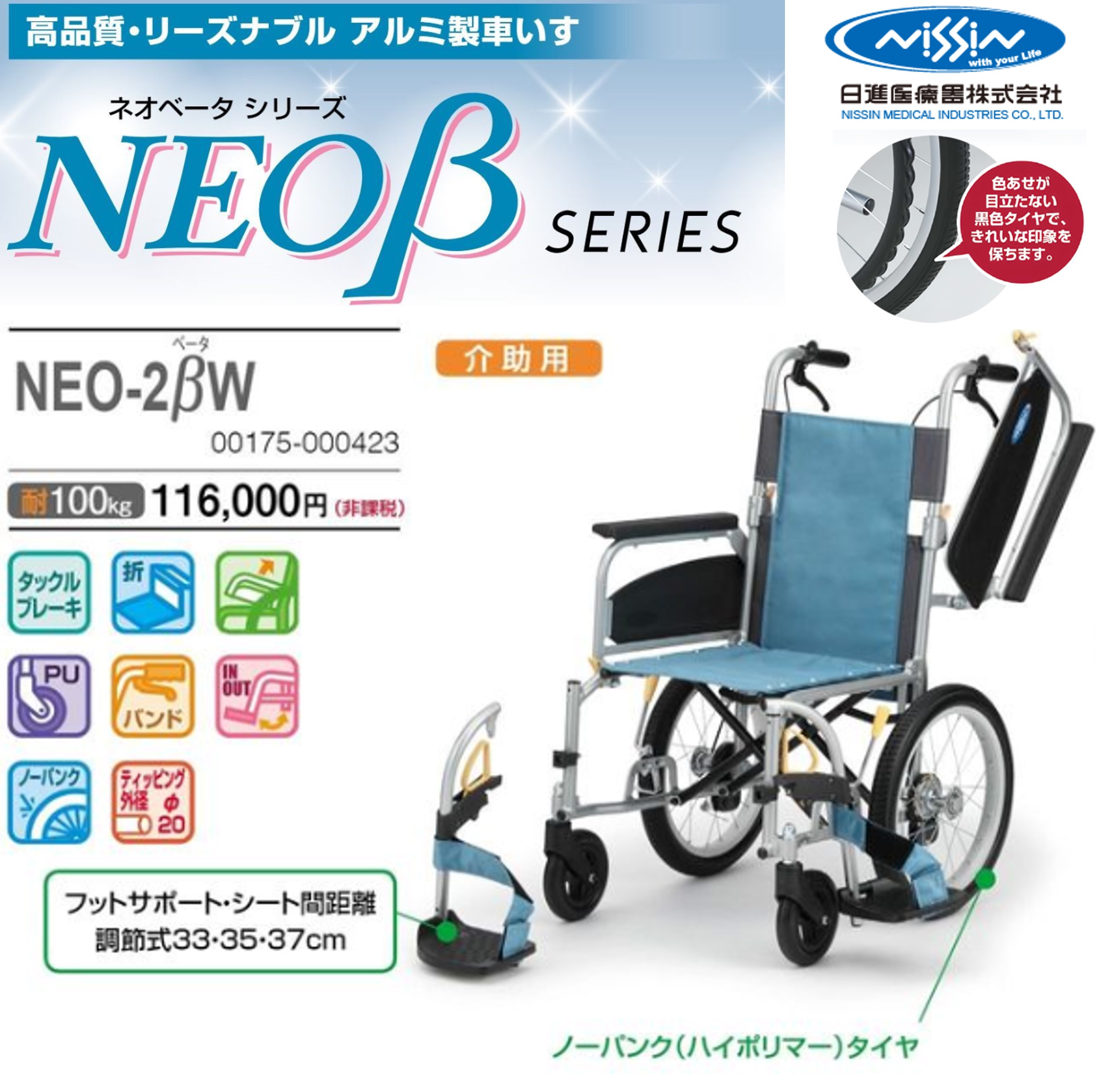 車椅子 軽量 介助式 NEO-2βW 多機能タイプ 座幅40cm ネオベータ アルミ製 車いす 個人宅配送無料 日進医療器