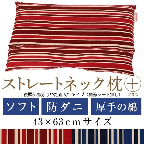 ストレートネック 枕 プラス 送料無料 43×63 cm サイズ 高さ調節 洗える 防ダニ 綿 わた ソフト パイプ トリノストライプ 通気性 まくら 首 肩 肩こり 日本製