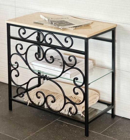 ※天板は完全な磨き上げではなく、石の凹凸や小キズ・欠け、磨き面の不均一さなどがみられますが、製造時からの仕上げです。アイアンの成形や塗装も手仕上げで完全な均一さはございません。