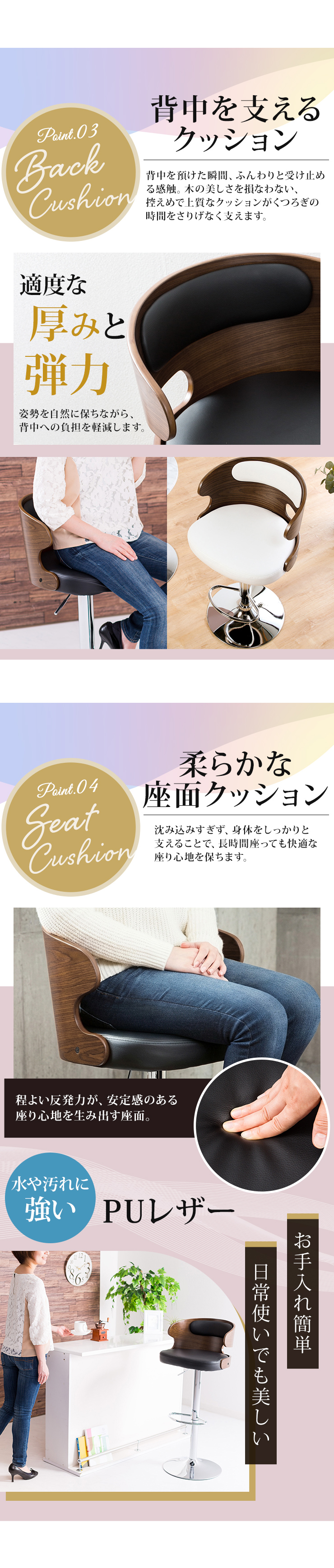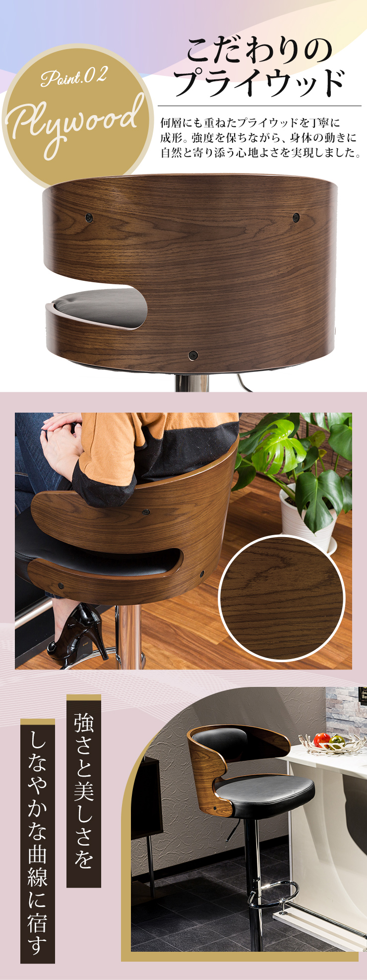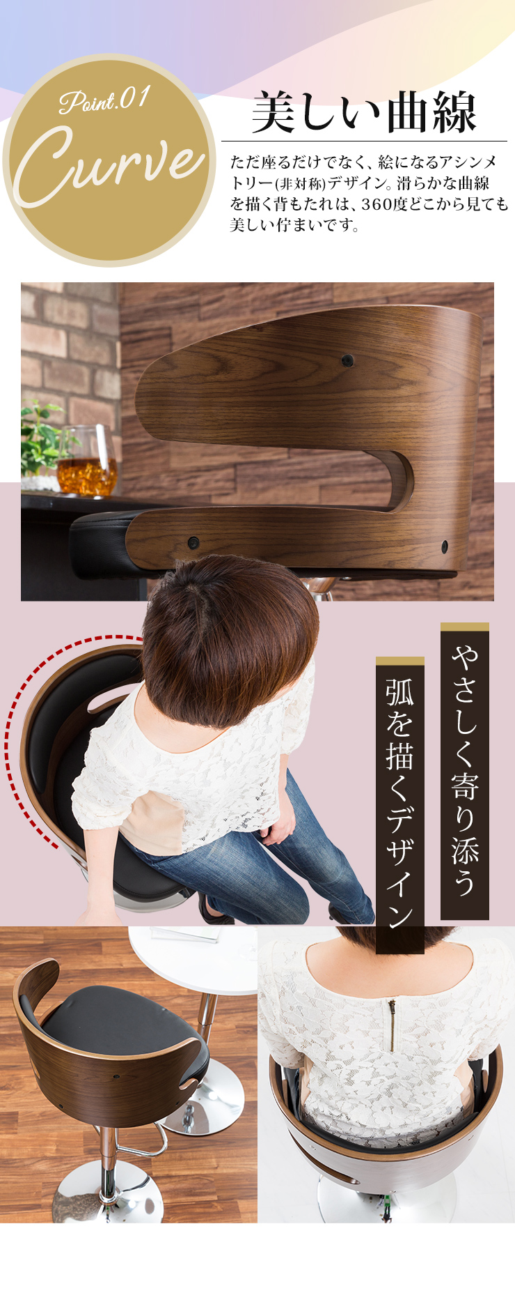 カウンターチェア 木製 バーチェア チェア クッション 左右非対称 アシンメトリー 曲線 木目 PU 昇降 360度回転 業務用