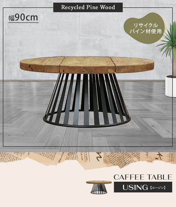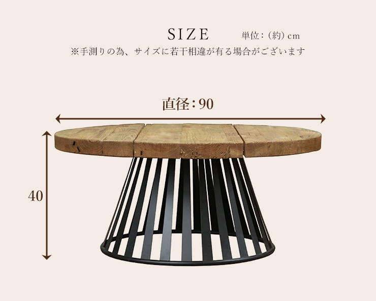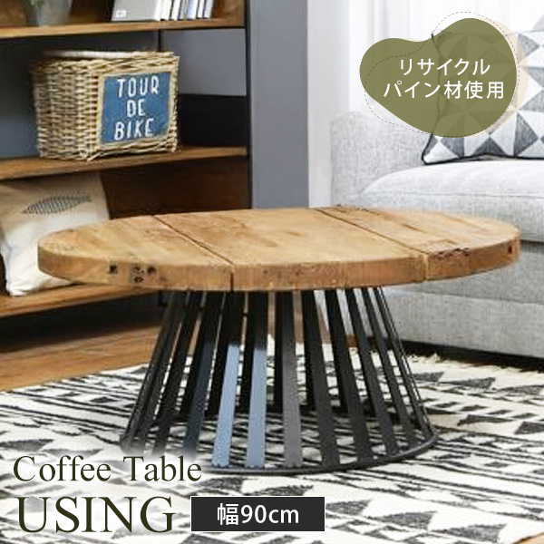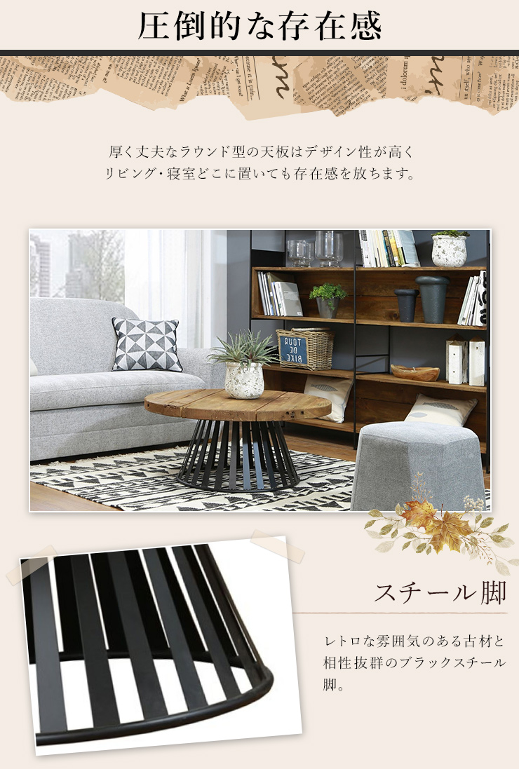 センターテーブル 円形テーブル 丸型 直径90cm ヴィンテージ調 古材 木製テーブル ローテーブル おしゃれ スチール脚 コーヒーテーブル