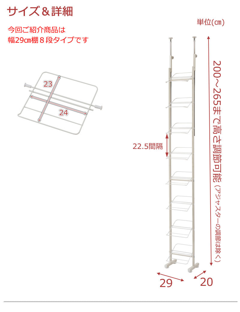 ■商品サイズ/本体:(約)幅29×奥行22.5×高さ200〜265cm、脚部アジャスター調節範囲/(約)1cm、棚間隔/(約)23cm