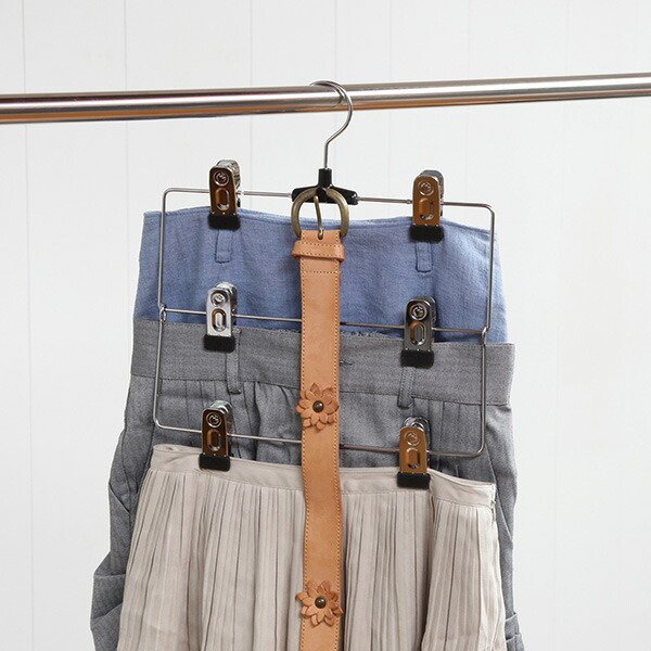 スカート3枚を効率よく収納することが出来るスカートハンガーです。金属のクリップがしっかり服をキャッチします。回転フック式なので向きを気にせずかけることが出来るので便利です。