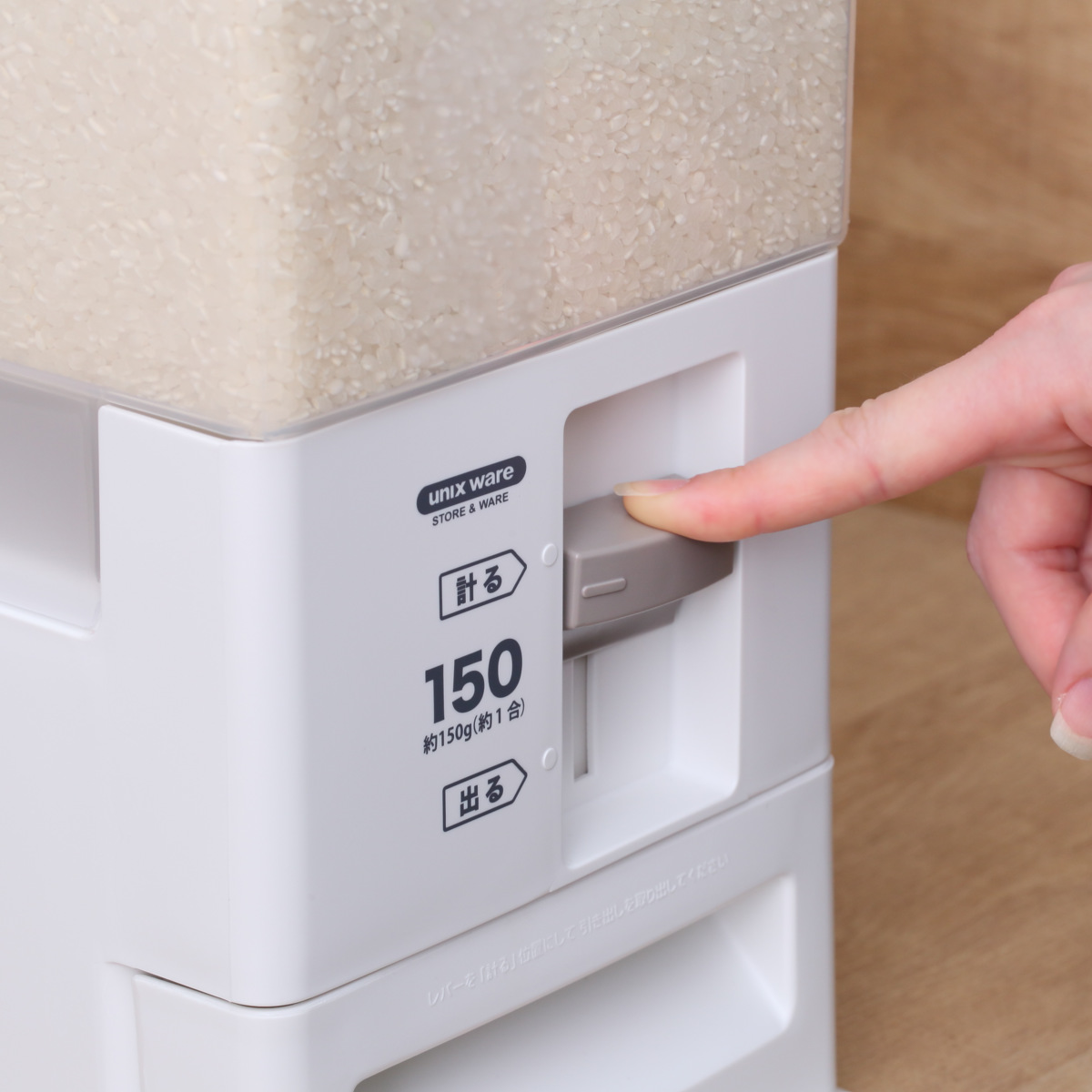 レバー操作で簡単計量簡単なレバー操作でお米が計量できる計量米びつです。レバーを下げると1合分のお米が計量されます。計量のたびにフタを開けて計量カップで計るという手間がありません。簡単にお米が計量できるので、お子さまのお手伝いにもおすすめです。