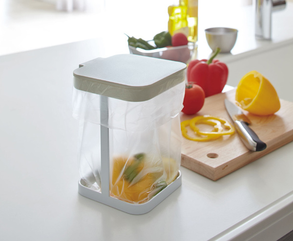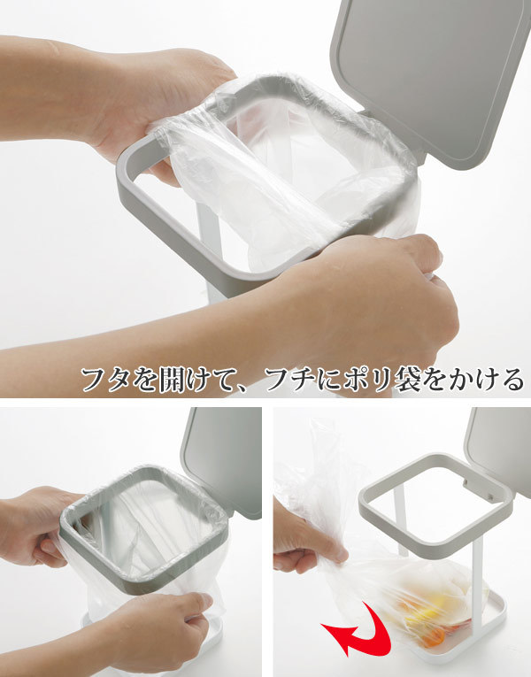 ネットやポリ袋を上からかぶせるだけで簡単に装着出来ます。ごみがいっぱいになったら袋を持って前からサッと引き出せるので、生ごみにも手を触れずに回収できて衛生的です。