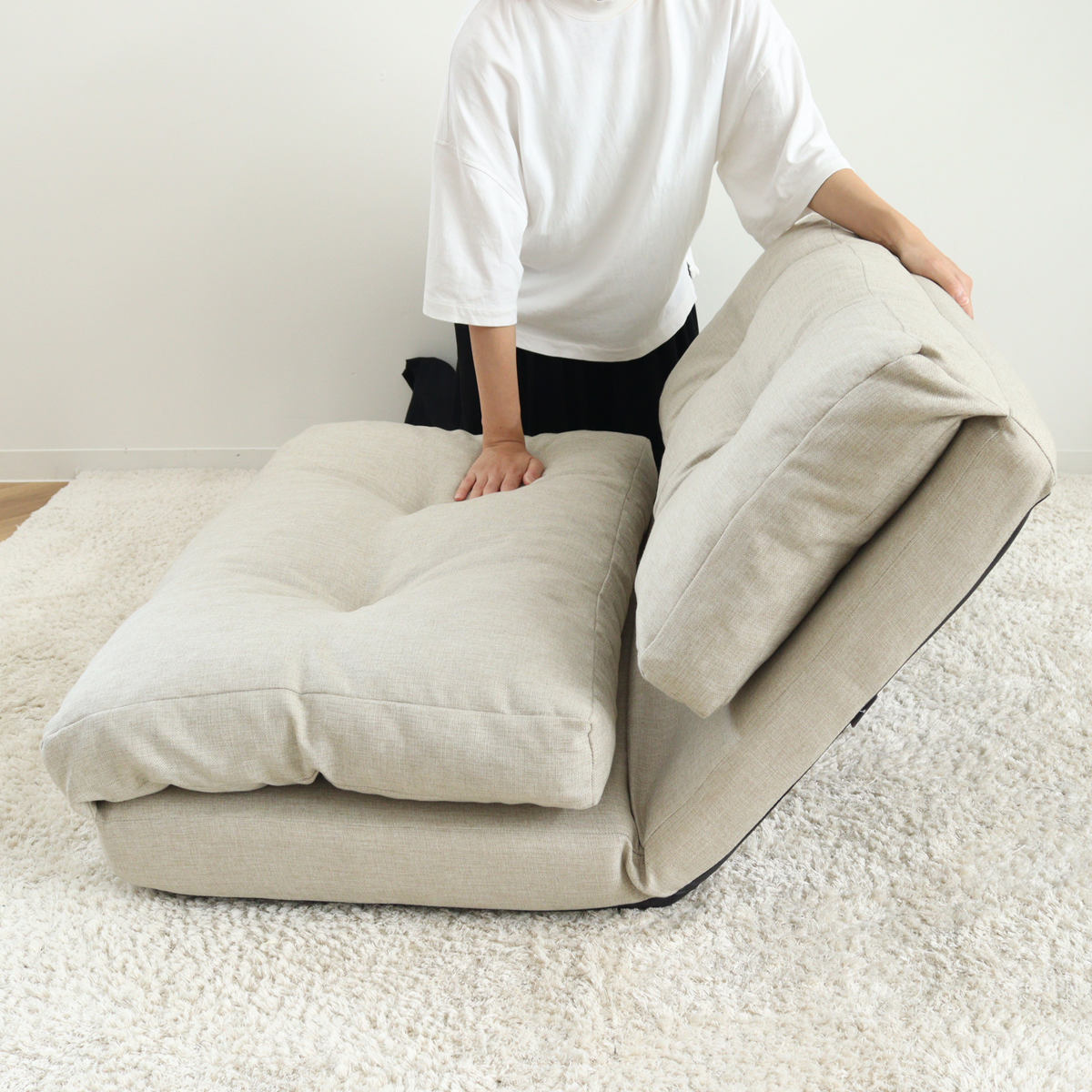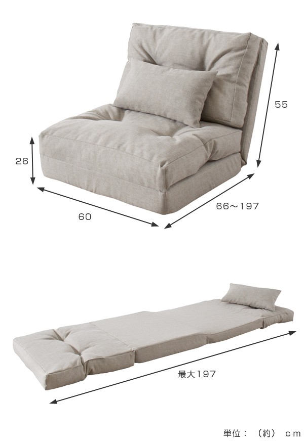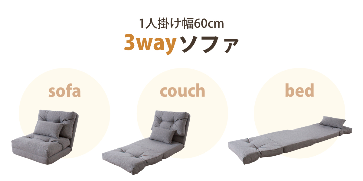 ソファ・カウチ・ベッドスタイルと3つのスタイルが楽しめるロータイプのソファーベッドです。幅60cmの1人掛けにちょうどいいサイズです。背もたれの角度も変えられるので、お好みのスタイルでリラックスして過ごせます。