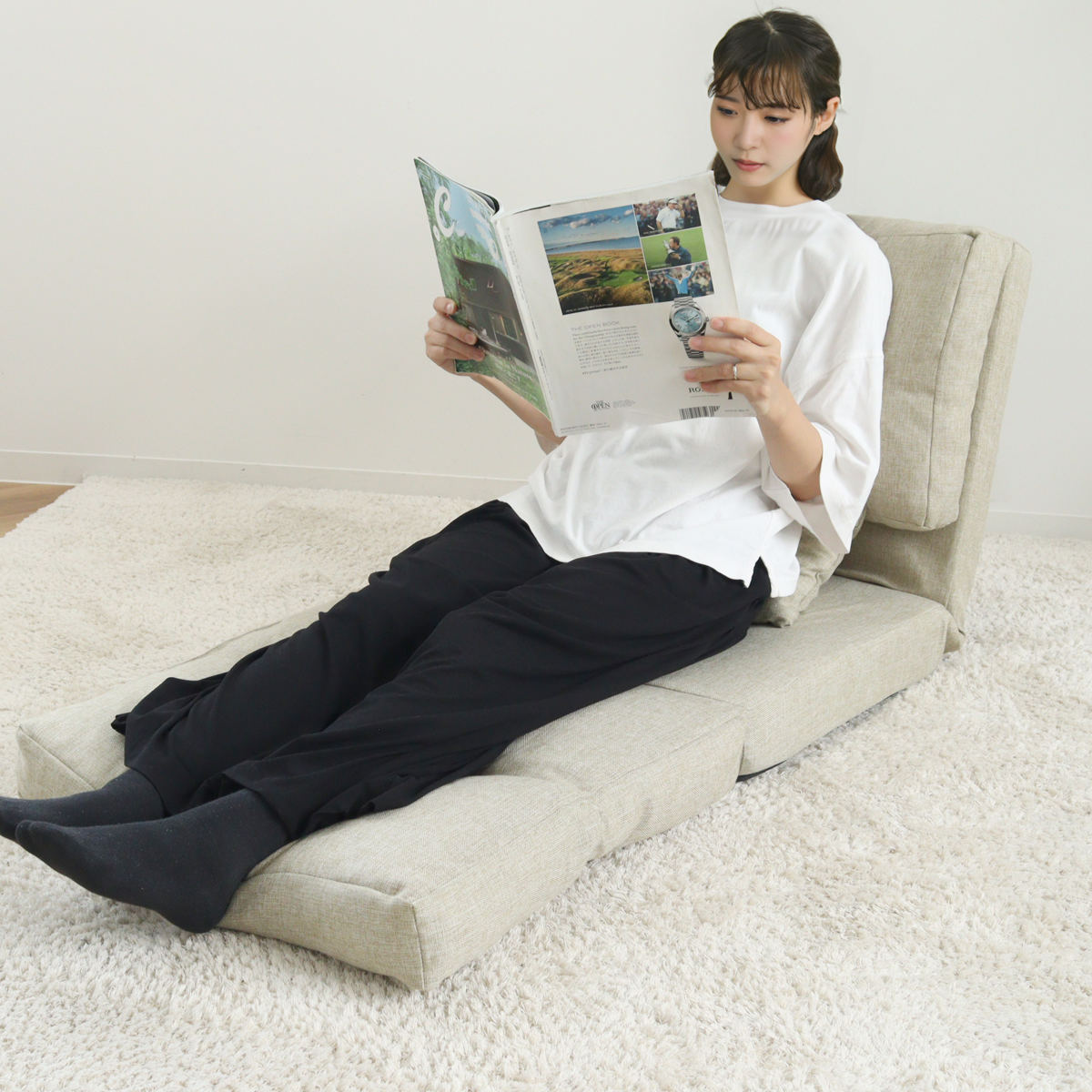 座面を広げると足元ひろびろのカウチソファに様変わり。背もたれの角度を細かく調節できるので、読書や映画鑑賞などさまざまなシーンで使えます。