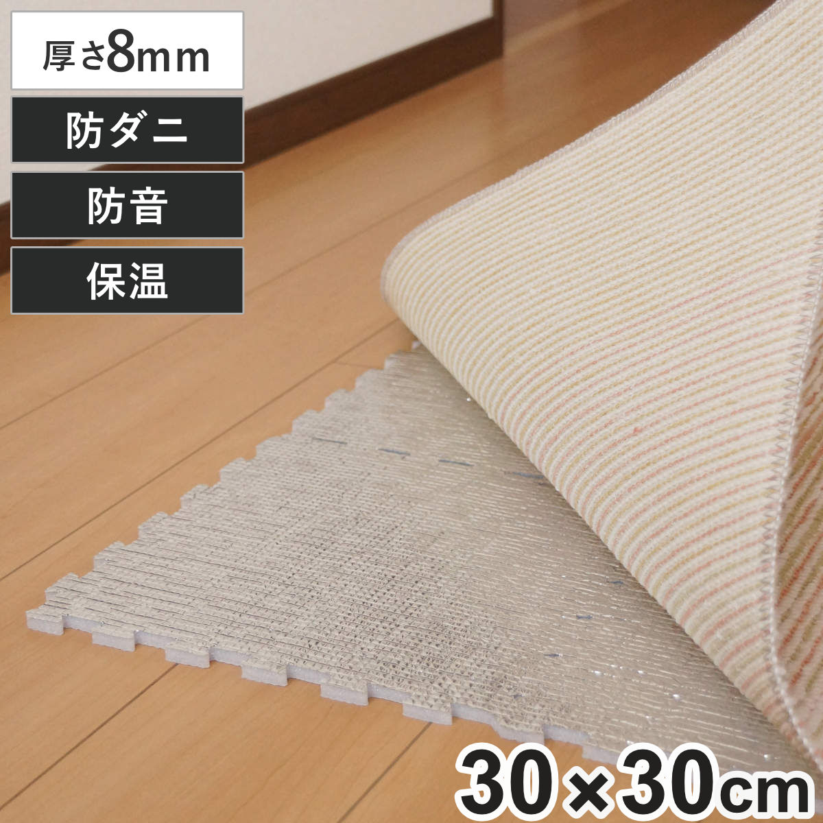 強力な防音効果を発揮するクッション性抜群のリビングマット厚さ8mmでクッション性抜群のジョイントタイプのリビングマットです。ホットカーペット用下敷き・保温シートとして快適なクッション性と保温力、強力な防音効果を発揮します。下の階へ響く、子どものおもちゃ音や、食器等、物の落下音、ドタドタとした足音を軽減します。またアルミ面には防ダニ加工がされているので、ダニを寄せ付けにくく、ダニの増殖を80%以上抑制します。