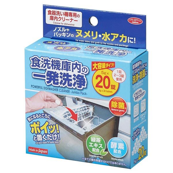 食器洗い機専用の庫内クリーナーです。食洗機の中に蓄積したノズルやパッキンの水垢、ヌメリの洗浄に最適です。除菌成分も配合しているので、いつでも清潔に衛生的に保つことができます。使い方は錠剤タイプで気になるところにポイッと置いて、標準コースで運転するだけと非常に簡単です。使用の目安は、4〜6人用の食洗機で1回2〜3個です。大容量の20錠入りなので、気になったらいつでも洗浄が可能です。【商品詳細】 内容量/1箱20錠入(1錠:5g) 材質/【成分】過炭酸塩、炭酸塩、炭酸水素ナトリウム、コハク酸、緑茶エキス、酵素 生産国/日本製《食器洗い洗浄機 ノズル パッキン ヌメリ ぬめり 緑茶エキス配合 清掃 掃除 清掃用品 掃除用品 大掃除 グッズ 用品 おすすめ よく取れる 大掃除用品 大掃除グッズ 清掃グッズ 掃除グッズ》