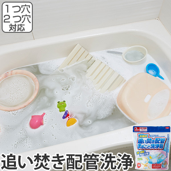 浸け置きタイプで追い焚き配管もまとめてキレイに洗浄します。酸素と酵素が汚れを分解して落とします。除菌も出来るので衛生的です。1つ穴、2つ穴どちらにも使用可能です。ふろイスや浴室小物などもまとめて洗浄できます。【商品詳細】 内容量/1袋(2回分) 材質/【成分】重曹、クエン酸、炭酸ナトリウム、過炭酸ナトリウム、界面活性剤、酵素、緑茶エキス、グレープフルーツ果皮油 生産国/日本製 備考/【使用できないもの】 追い焚き機能のないもの、木製・大理石製の風呂、海外製の浴槽《浴槽 風呂釜 バス用 清掃用品 掃除グッズ 掃除用品 風呂掃除 洗面器 風呂いす 湯垢 水垢 水アカ バスタブ 清掃グッズ 水あか ヌメリ お風呂掃除 大掃除 グッズ 用品 おすすめ よく取れる よく落ちる 大掃除用品 大掃除グッズ》