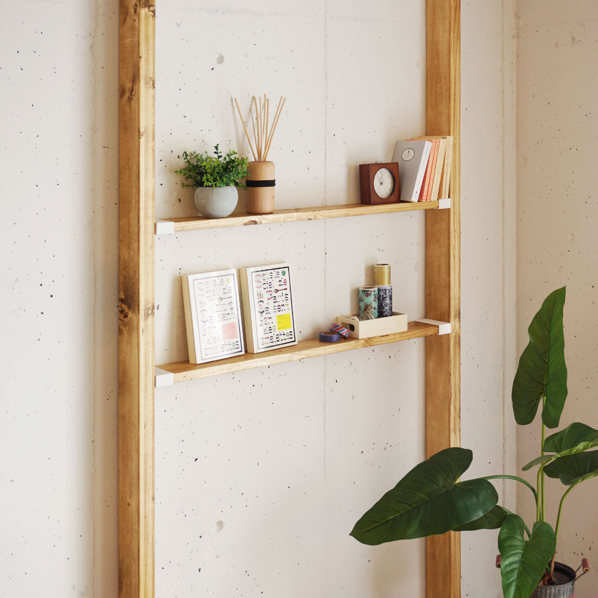 ネジ穴が見えないデザインワンバイ材のスリム感を損なわないシンプルなデザインで、留め具やねじが正面から見えません。お部屋のインテリアにもスッキリ馴染みます。