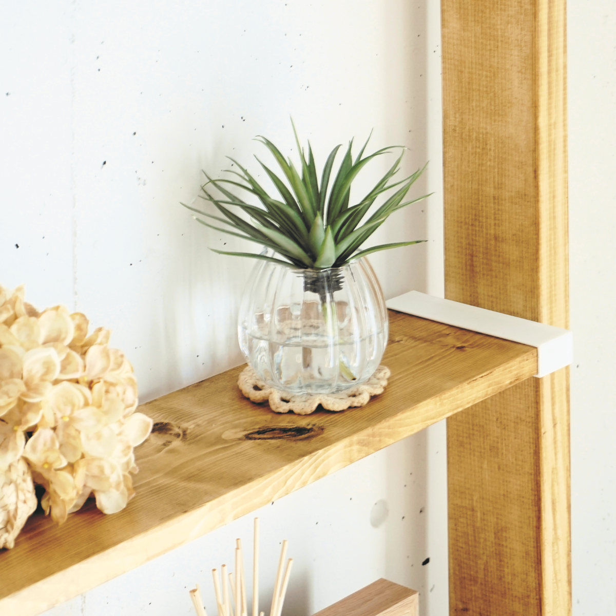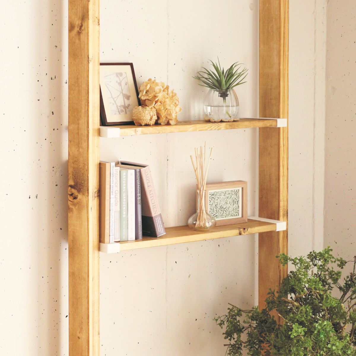 ネジ穴が見えないデザインワンバイ材のスリム感を損なわないシンプルなデザインで、留め具やねじが正面から見えません。お部屋のインテリアにもスッキリ馴染みます。