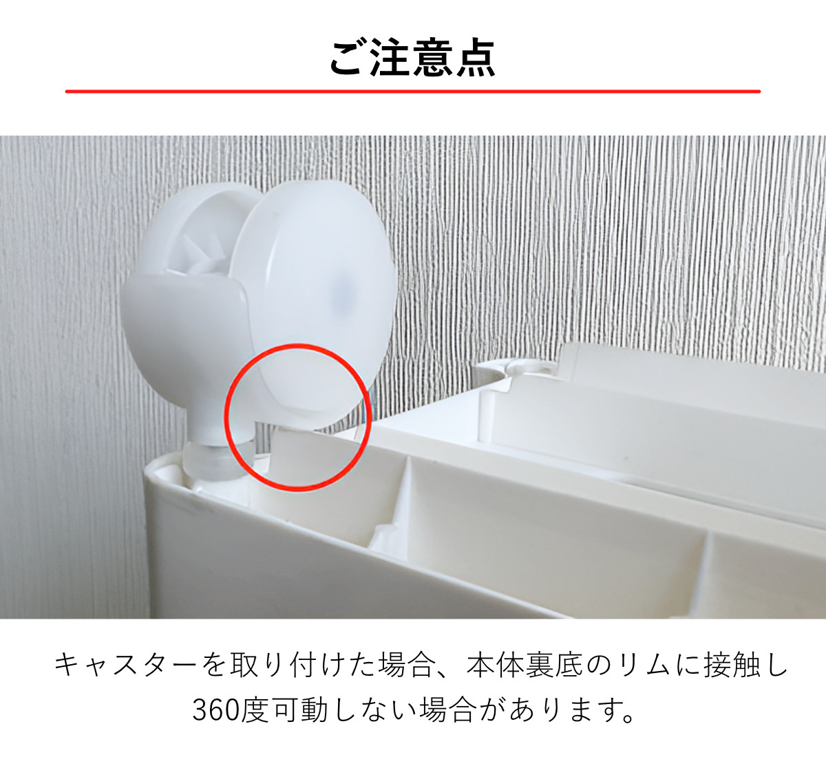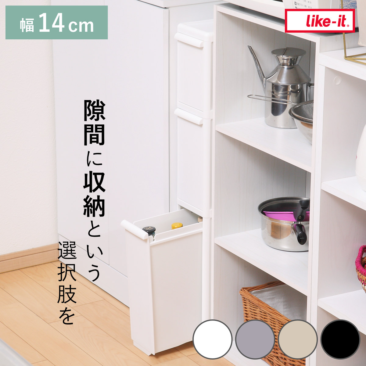 | 注意事項 | ※14cm幅シリーズは、本体幅が狭いため分解すると破損する恐れがありますのでご注意ください。 ※キャスターを取り付けた場合、底リムに接触し、360度可動しない場合があります。 ※商品ページ内には別の商品を含む画像を使用しています。 |