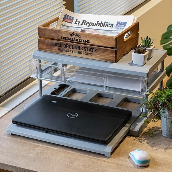 ノートPCをたたんで収納できるPCラックです。プリンタステージの上にはプリンターはもちろん、電話や小物も置くことができ、机の上がスッキリ片付きます。