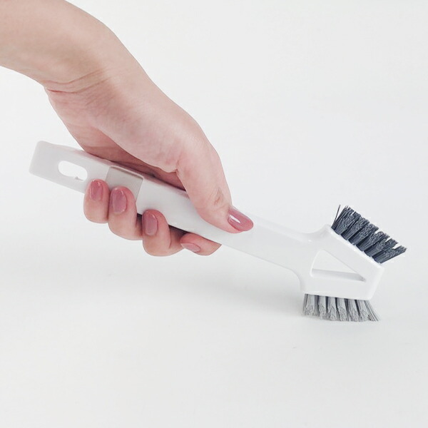 ハードとソフト、硬さの違う毛先で洗い分けできるダークグレーのハードブラシは硬めなのでゴシゴシこすり洗いにおすすめです。ライトグレーのソフトブラシは隙間や細かな箇所を洗うのに適しています。先端のヘラはこびりついた汚れ落としに。