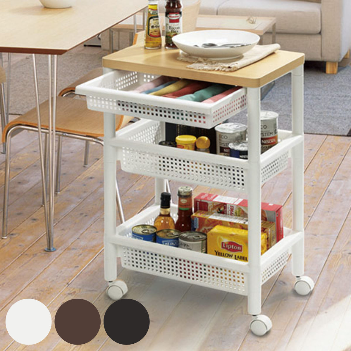 安定感のある木製天板&便利な引出し本体はプラスチック製で軽量ですが、天板は木製のため安定して物が置け、インテリアにも馴染みやすいです。天板下の引き出しは、カトラリーやクロスなどちょっとした小物収納に便利です。