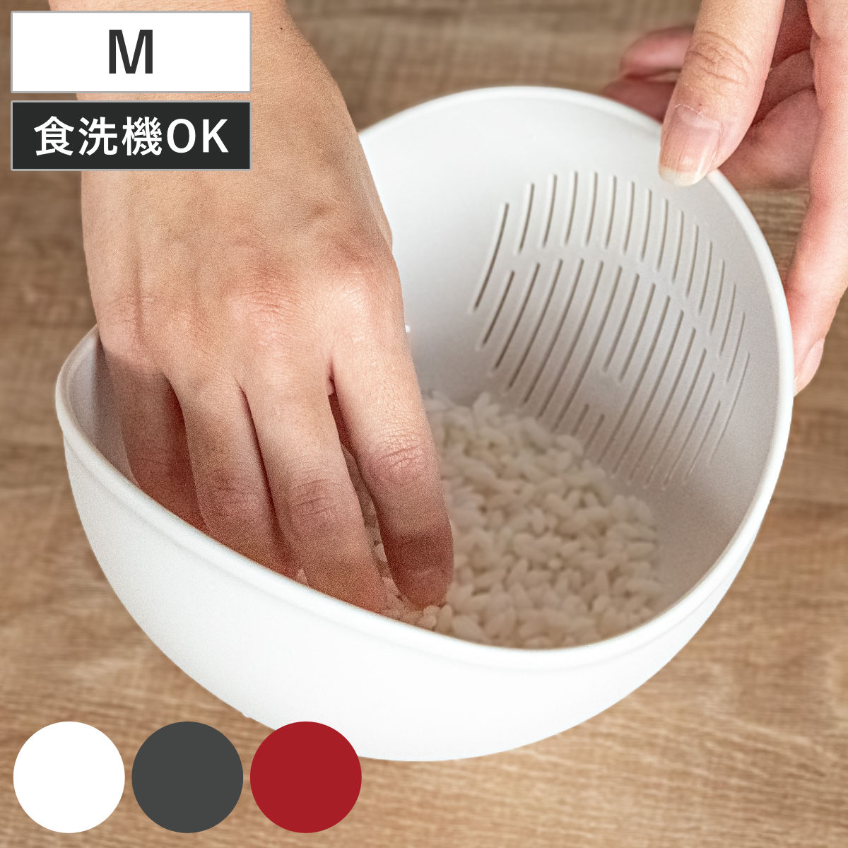 水切れのよいスリット水がサッと切れるように、線状のスリットが入っています。米粒が目詰まりしにくい形状なので、米とぎボウルとしても便利にお使いいただけます。