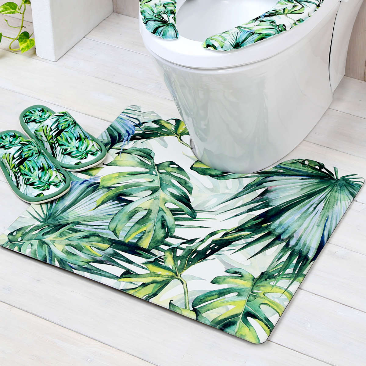 滑りにくい 洗濯不要 お手入れ簡単 防炎 おしゃれ 55×60 単品 トイレ用品 トイレタリー リーフ リーフ柄 葉 南国 アジアン インテリア 緑 グリーン LH2837