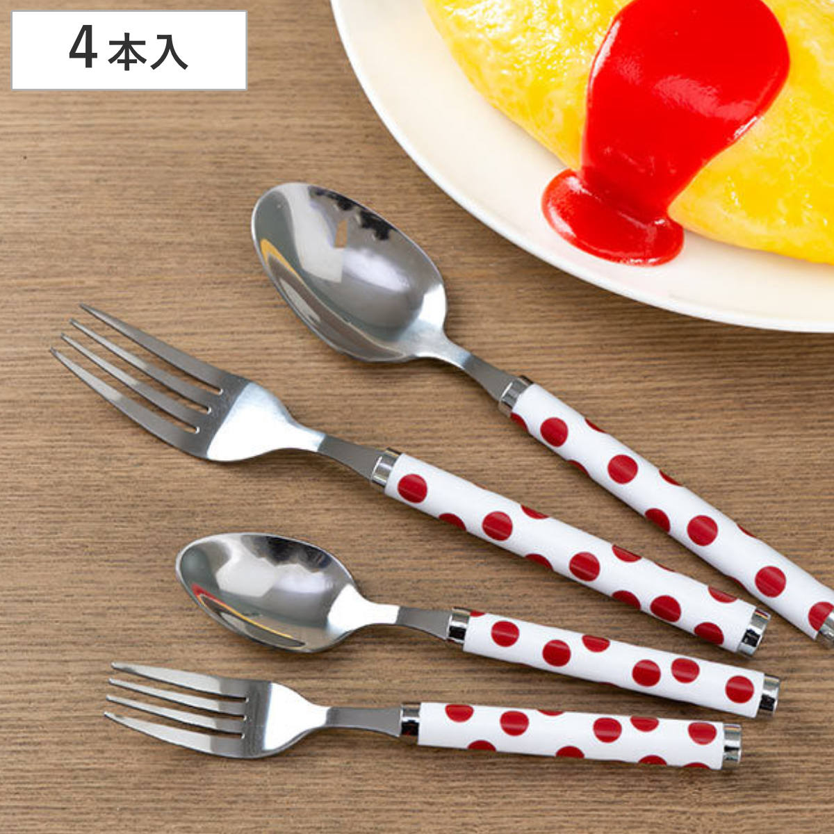 スプーン フォーク 大 小 セット 4本入り ステンレス ドット 赤 ( 洋食器 カトラリー 大きい 盛り付け カレー デザート )