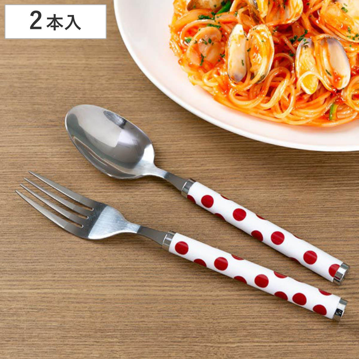 ドット柄スプーン&フォーク 2本セットパスタやカレーなどメイン料理に使いやすい大きめサイズのスプーン&フォーク、2本セットです。