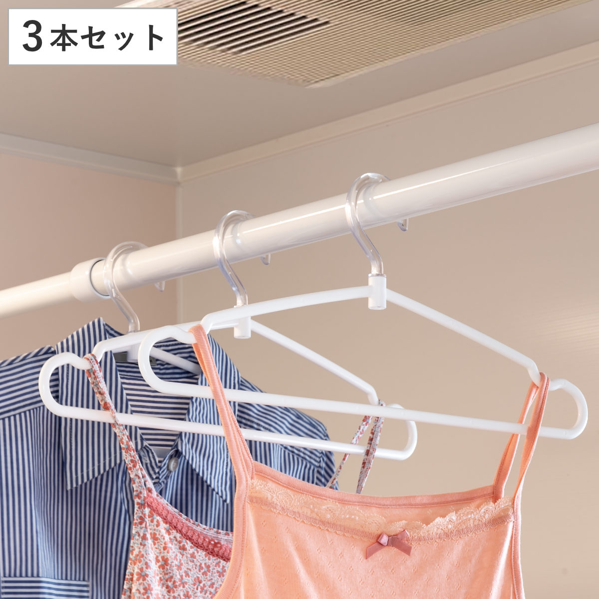 | ひも掛け付き キャミソールなどの肩ひもや、スカートのひもが掛けられます。男性、女性どちらの衣類でも掛けられる肩幅41cmのワイドタイプです。 | 45度ずつ回るフック 斜め干しが出来て、狭いスペースでも壁などに当たらないように干すことが出来ます。※45度ずつ止まるためクルクルは回りません。 |
