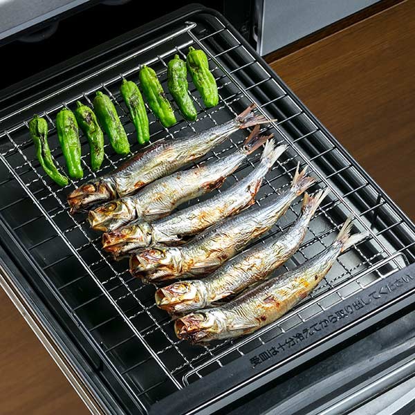 ワイドサイズ・アミ付きガス・IHコンロのグリル・オーブントースターで、簡単に料理ができて便利なワイドサイズのグリルトレイ・アミ付きです。小さな食材もアミから落ちません。