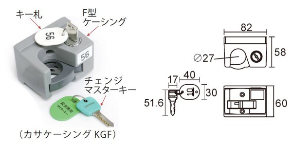 シリンダー錠タイプ鍵仕様本体がABS製で、小判札付のキーを採用しています。チェンジマスターキーは1台につき1個付属します。